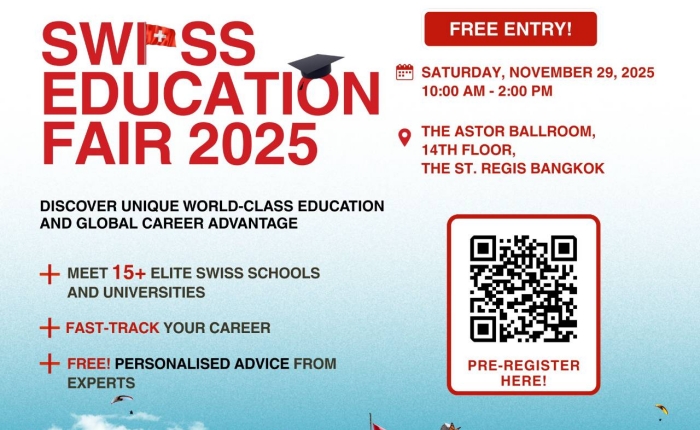 “Swiss Education Fair 2025” งานแนะแนวการศึกษาสวิตเซอร์แลนด์ครั้งยิ่งใหญ่ที่สุดในประเทศไทย ในวันเสาร์ที่ 29 พฤศจิกายน 2568 เวลา 10.00 – 14.00 น. ณ The Astor Ballroom ชั้น 14 โรงแรม เดอะ เซนต์ รีจิส กรุงเทพ