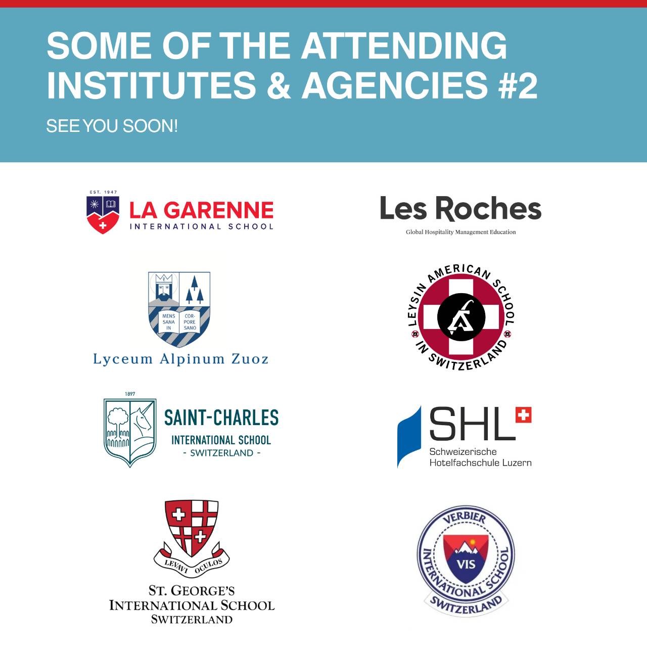 ภายในงานจะได้พบปะผู้แทนจากโรงเรียนและมหาวิทยาลัยชั้นนำของสวิตเซอร์แลนด์ที่บินตรงมาร่วมงานเพื่อพูดคุยและให้ข้อมูลแบบ Exclusive เริ่มตั้งแต่โรงเรียนในระดับประถมศึกษา (Boarding School) ไปจนถึงการศึกษาระดับปริญญาตรีและปริญญาโทในมหาวิทยาลัยชันนำ ได้แก่ Brillantmont International School, Business & Hotel Management School (BHMS), Collège Alpin Beau Soleil, Collège Champittet, EU Business School Geneva, Geneva School of Diplomacy and International Relations, Glion Institute of Higher Education, Institut auf dem Rosenberg, Institut Montana, La Garenne International School, Le Régent International School,Les Roches Global Hospitality Education, Leysin American School, Lyceum Alpinum Zuoz, Saint-Charles International School, SHL Schweizerische Hotelfachschule Luzern, St. George’s International School และ Verbier International School