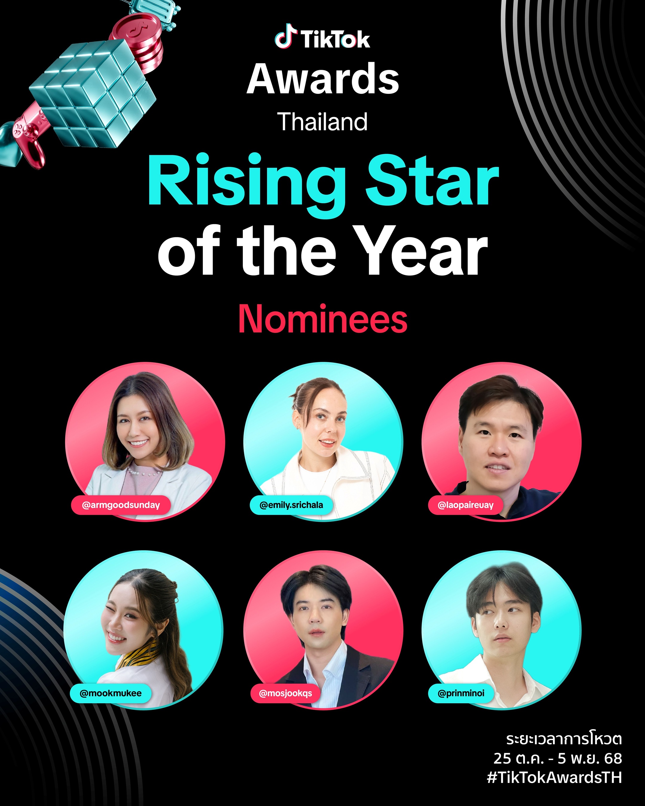 ขณะที่หมวด People’s Choice Awards จะตัดสินจากคะแนนโหวตของผู้ใช้งานบนแพลตฟอร์ม ประกอบด้วย 6 สาขารางวัล โดยเพิ่มเติมรางวัล Rising Star of the Year ครีเอเตอร์ที่มีชื่อเสียงและอิทธิพลเพิ่มขึ้นอย่างรวดเร็วตลอดปีที่ผ่านมา แม้จะเป็นหน้าใหม่ในวงการ แต่ความคิดสร้างสรรค์และพลังของพวกเขาได้ทำให้กลายเป็นครีเอเตอร์ดาวรุ่งที่กำลังเฉิดฉายในโลกของ TikTok และรางวัล Storyteller of the Year ส่งต่อเรื่องราวผ่านคอนเทนต์ที่มีความคิดสร้างสรรค์และโดดเด่นไม่เหมือนใคร