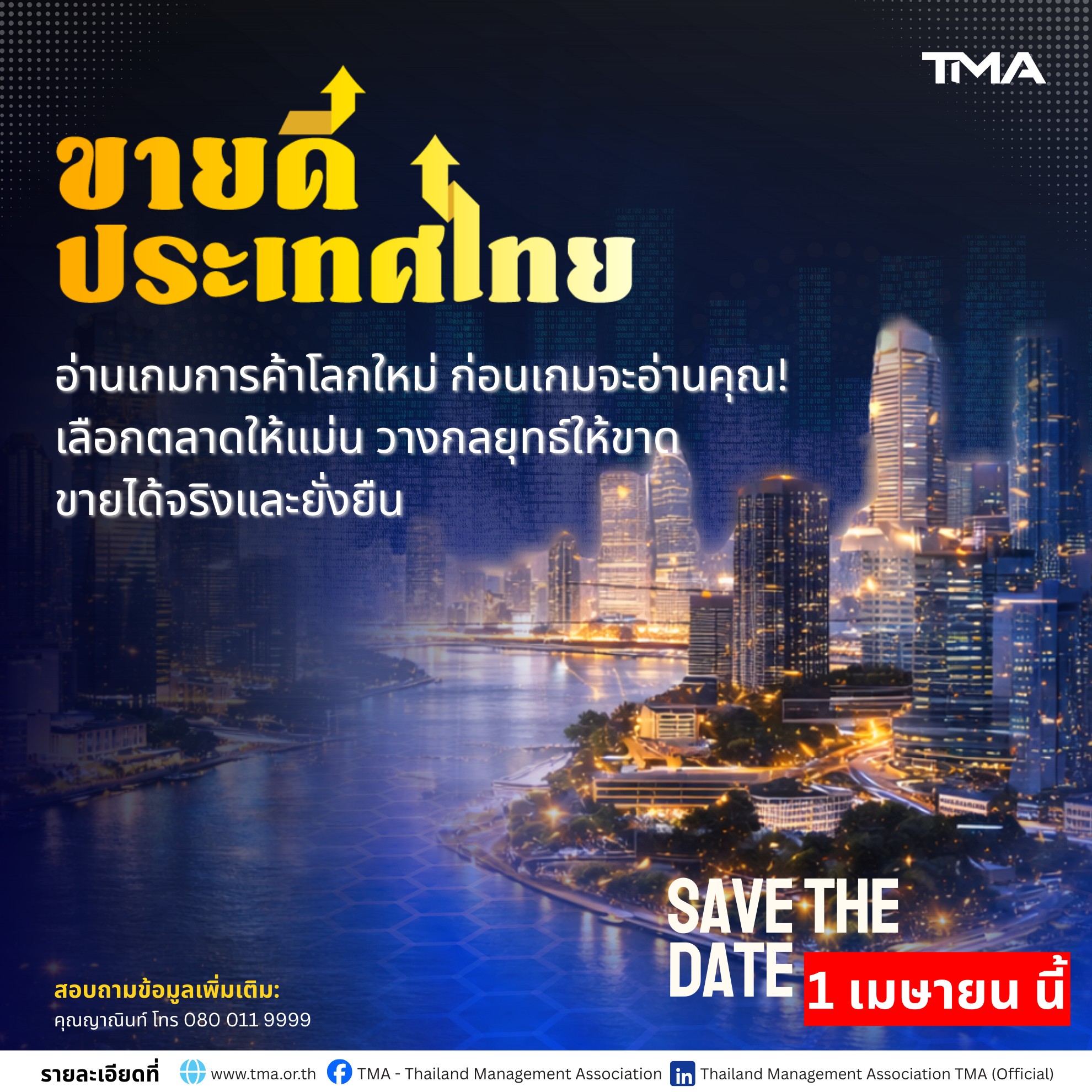 งาน “ขายดีประเทศไทย: ของดีไทย สู่ตลาดโลก” จะจัดขึ้น ในวันพุธที่ 1 เมษายน 2569 เวลา 09.00 – 16.30 น. ผู้สนใจสามารถดูรายละเอียดงานได้ที่ www.tma.or.th งานนี้เหมาะสำหรับผู้บริหารและผู้ประกอบการที่ต้องการมากกว่าแค่การอยู่รอด แต่พร้อมจะอ่านเกมให้ขาด และขายให้โลกซื้อ