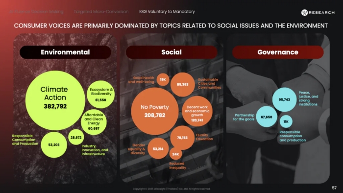 ข้อมูลจากการสนทนาบนโซเชียลชี้ว่า ผู้บริโภคให้ความสำคัญกับ “ประเด็นสังคม” (44%) และ “สิ่งแวดล้อม” (43%) มากที่สุด ตามด้วย “ธรรมาภิบาล” (13%) แนวโน้มนี้สะท้อนว่ากระแสถกเถียงบนโลกออนไลน์มักผูกโยงกับหัวข้อ ESG