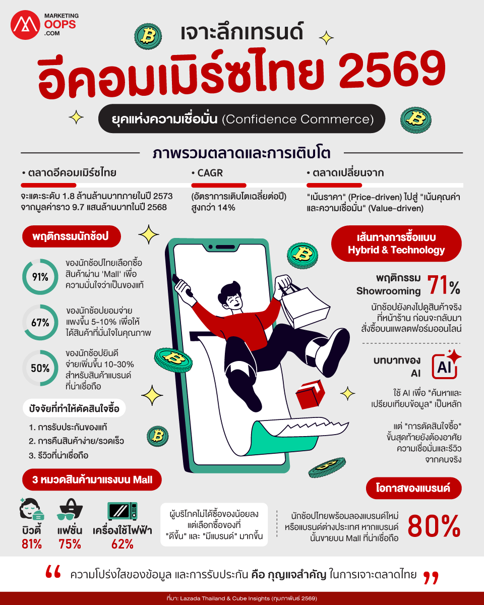 ตลาดอีคอมเมิร์ซในประเทศไทยกำลังเติบโตอย่างต่อเนื่อง รายงานจาก Cube Insights และ Lazada ระบุว่ามูลค่าตลาดจะเพิ่มขึ้นจาก 9.7 แสนล้านบาทในปี 2568 ไปถึง 1.8 ล้านล้านบาทภายในปี 2573 โดยมีอัตราการเติบโตเฉลี่ยปีละ 14% ตลาดไทยกำลังก้าวข้ามยุคการแข่งขันกันด้วยราคาเพียงอย่างเดียว และเข้าสู่ยุคที่ความเชื่อมั่นของลูกค้าเป็นตัวตัดสินว่าแบรนด์ไหนจะเป็นผู้ชนะ