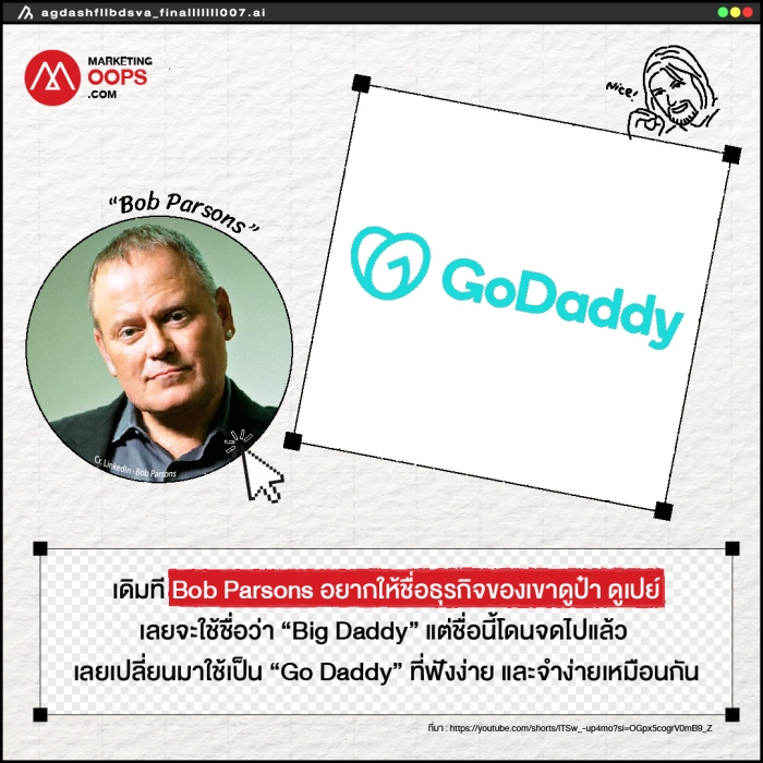 Go Daddy : เดิมที Bob Parsons อยากให้ชื่อธุรกิจของเขาดูป๋า ดูเปย์ เลยจะใช้ชื่อว่า “Big Daddy” แต่ชื่อนี้โดนจดไปแล้ว เลยเปลี่ยนมาใช้เป็น “Go Daddy” ที่ก็ฟังง่าย จำง่ายเหมือนกัน