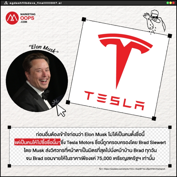 Tesla : ก่อนอื่นต้องเข้าใจก่อนว่า Elon Musk ไม่ได้เป็นคนตั้ง แต่เป็นคนให้ไปซื้อมา ซึ่ง Tesla Motors ชื่อนี้ถูกครอบครองโดย Brad Siewert โดย Musk ส่งวิศวกรที่หน้าตาเป็นมิตรที่สุดไปนั่งหน้าบ้าน Brad ทุกวัน จน Brad ยอมขายให้ในราคาเพียงแค่ 75,000 เหรียญสหรัฐฯเท่านั้น