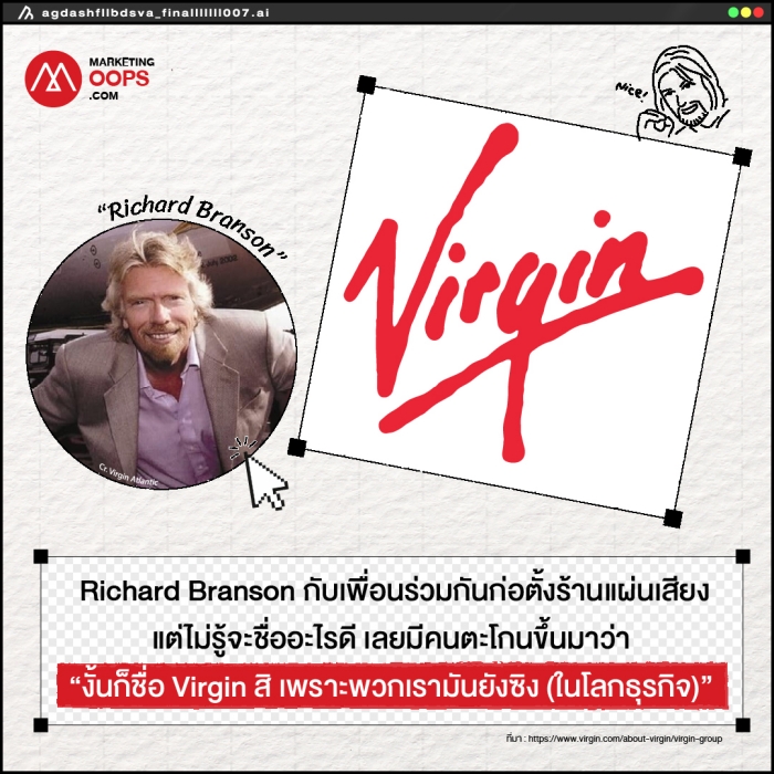 Virgin : Richard Branson กับเพื่อนร่วมกันก่อตั้งร้านแผ่นเสียง แต่ไม่รู้จะชื่ออะไรดี เลยมีคนตะโกนขึ้นมาว่า “งั้นก็ชื่อ Virgin สิ เพราะพวกเรามันยังซิง (ในโลกธุรกิจ)”