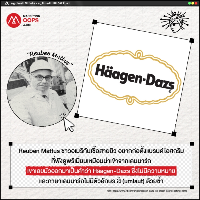 Häagen-Dazs : Reuben Mattus ชาวอเมริกันเชื้อสายยิว อยากก่อตั้งแบรนด์ไอศกรีมที่ฟังดูพรีเมี่ยมเหมือนนำเข้าจากเดนมาร์ก เขาเลยมั่วออกมาเป็นคำว่า Häagen-Dazs ซึ่งไม่มีความหมาย และภาษาเดนมาร์กไม่มีตัวอักษร ä (umlaut) ด้วยซ้ำ