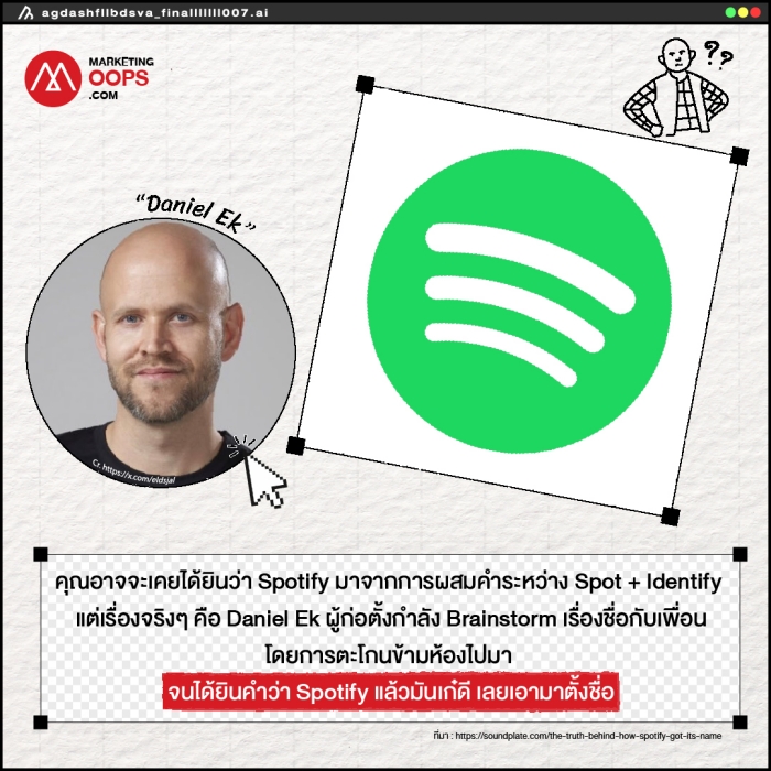 Spotify : คุณอาจจะเคยได้ยินว่า Spotify มาจากการผสมคำระหว่าง Spot + Identify แต่เรื่องจริงๆ คือ Daniel Ek ผู้ก่อตั้งกำลัง Brainstorm เรื่องชื่อกับเพื่อนโดยการตะโกนข้ามห้องไปมา จนได้ยินคำว่า Spotify แล้วมันเก๋ดี เลยเอามาตั้งชื่อ