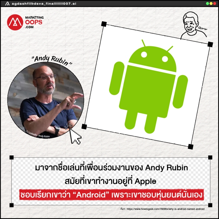 Android : มาจากชื่อเล่นที่เพื่อนร่วมงานของ Andy Rubin สมัยที่เขาทำงานอยู่ที่ Apple ชอบเรียกเขาว่า “Android” เพราะเขาชอบหุ่นยนต์นั่นเอง