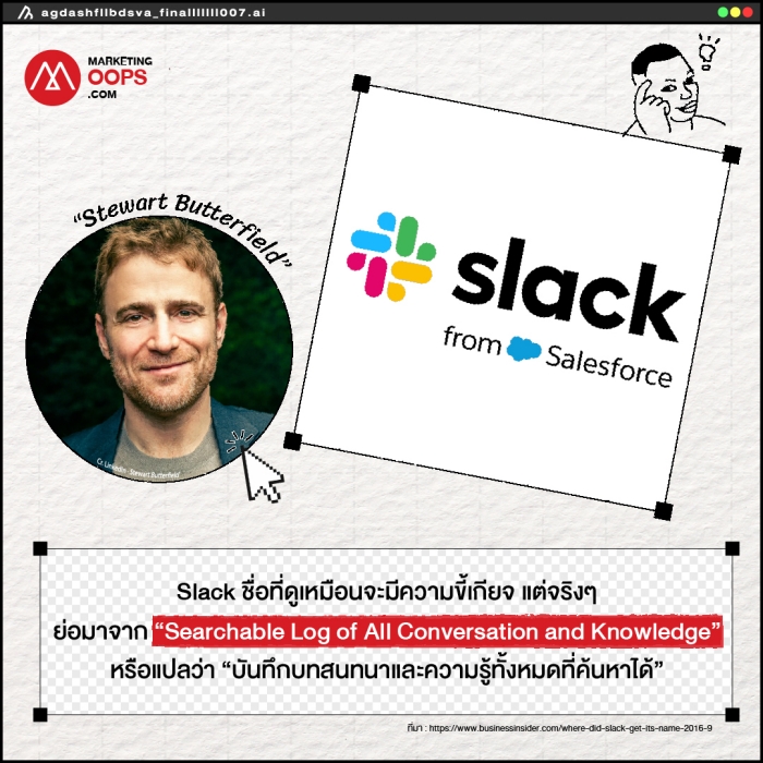 Slack : ชื่อที่ดูเหมือนจะมีความขี้เกียจ แต่จริงๆ ย่อมาจาก “Searchable Log of All Conversation and Knowledge” หรือแปลว่า “บันทึกบทสนทนาและความรู้ทั้งหมดที่ค้นหาได้”