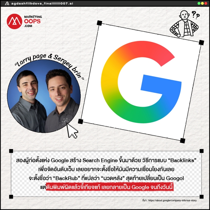 Google : Larry และ Sergey สองผู้ก่อตั้งแห่ง Google สร้าง Search Engine ขึ้นมาด้วยวิธีการแบบ “Backlinks” เพื่อจัดอันดับเว็บ เลยอยากจะตั้งชื่อให้มันมีความเชื่อมโยงกันเลยจะตั้งชื่อว่า “BackRub” ที่แปลว่า “นวดหลัง” สุดท้ายเปลี่ยนเป็น Googol แต่ดันพิมพ์ผิดแล้วขี้เกียจแก้ เลยกลายเป็น Google จนถึงวันนี้