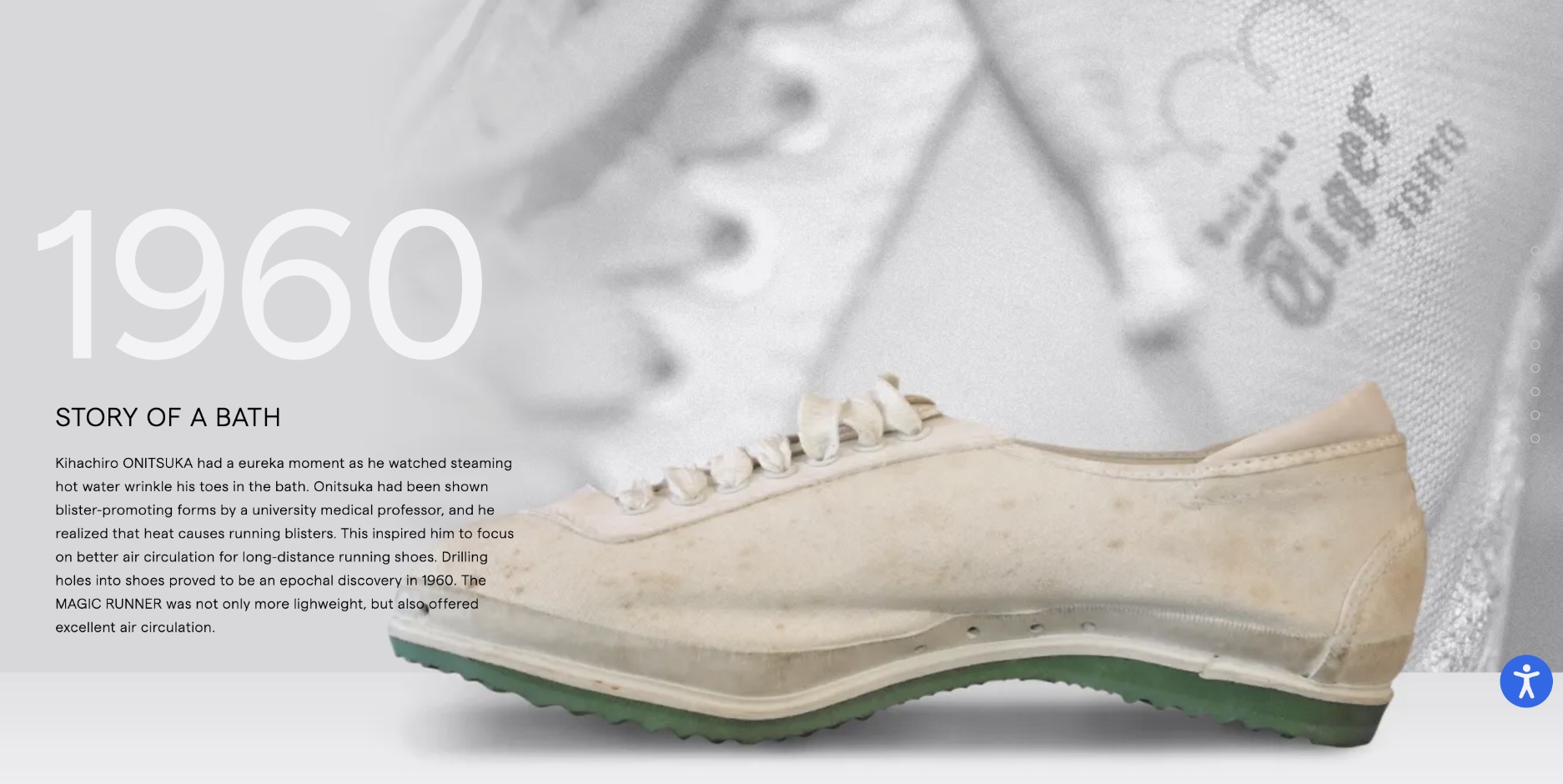 โอนิซึกะ ได้ไอเดียทำรองเท้าวิ่งตอนที่กำลังแช่น้ำร้อนในอ่างอาบน้ำ เขาสังเกตเห็นนิ้วเท้าตัวเองเหี่ยวย่น จึงเกิดความเข้าใจว่า “ความร้อน” คือสาเหตุหลักที่ทำให้เท้าพอง เขาเลยได้ไอเดียสร้างรองเท้าที่มีระบบระบายอากาศ นำไปสู่การดีไซน์รองเท้าที่มีรูระบายอากาศคล้ายหม้อน้ำรถยนต์ เพื่อลดความร้อนสะสมขณะวิ่งได้สำเร็จ เกิดเป็นรองเท้า Onitsuka Magic Runner ขึ้นมา