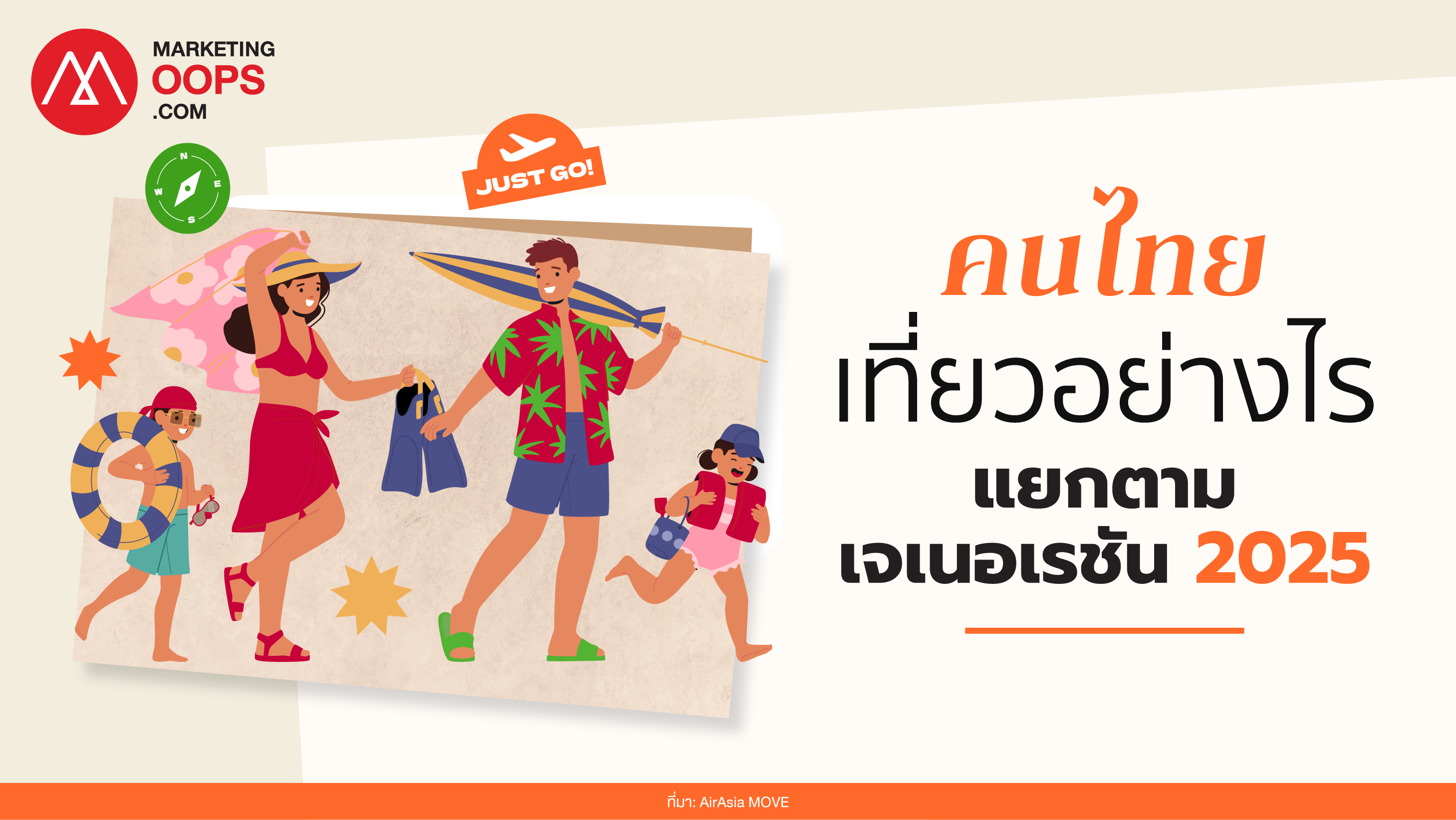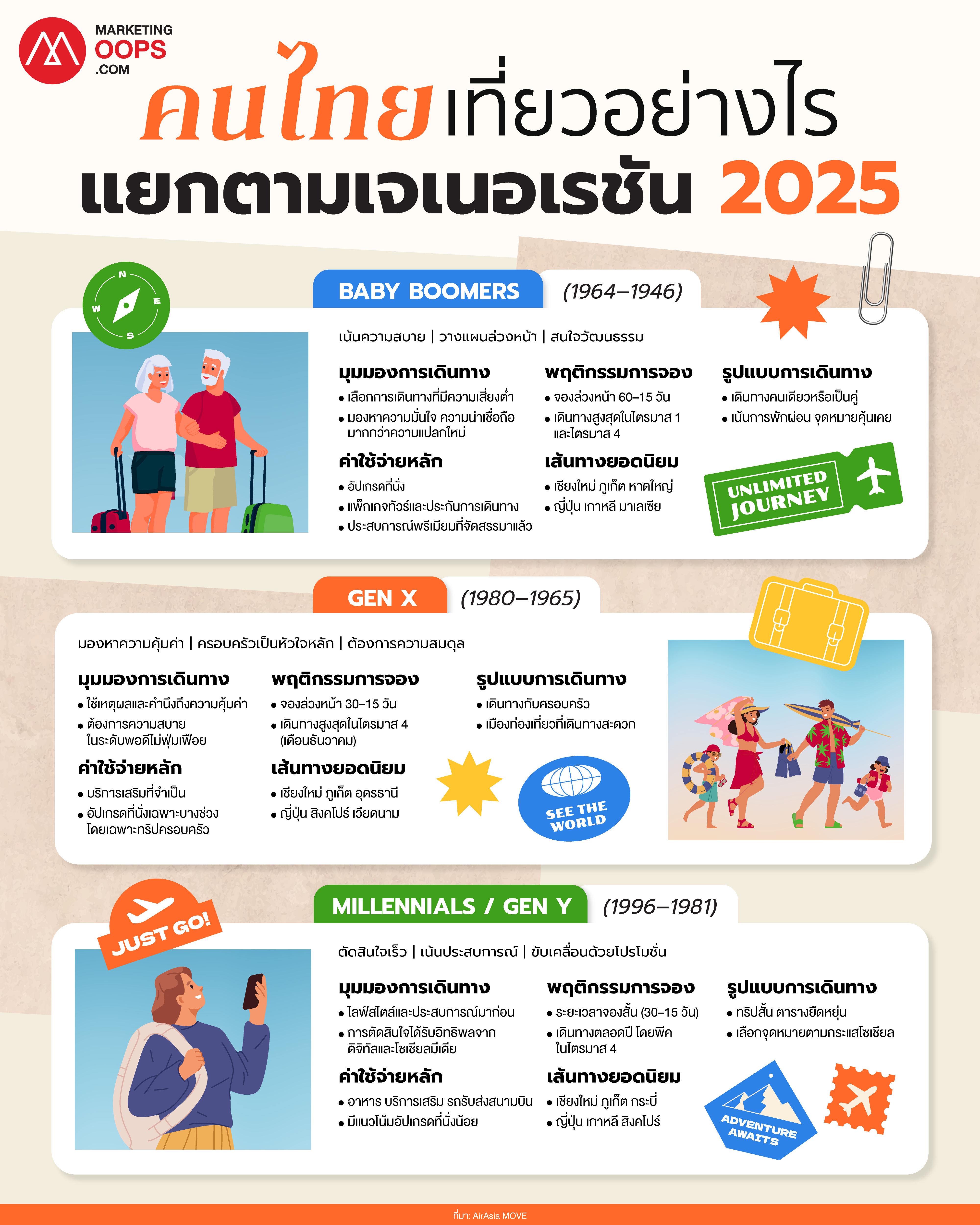 แพลตฟอร์มจองการเดินทาง AirAsia MOVE เปิดเผยรายงานเชิงข้อมูล วิเคราะห์พฤติกรรมการเดินทางของนักท่องเที่ยวไทย 3 เจเนอเรชันหลัก ได้แก่ Baby Boomers, Gen X และ Millennials ในปี 2025 รายงานฉบับนี้อ้างอิงจากฐานข้อมูลการจองหลายล้านรายการ ครอบคลุม เที่ยวบิน โรงแรม และบริการเสริม เพื่อติดตามพฤติกรรมการวางแผน การจอง และการใช้จ่ายของนักเดินทางในแต่ละช่วงวัย