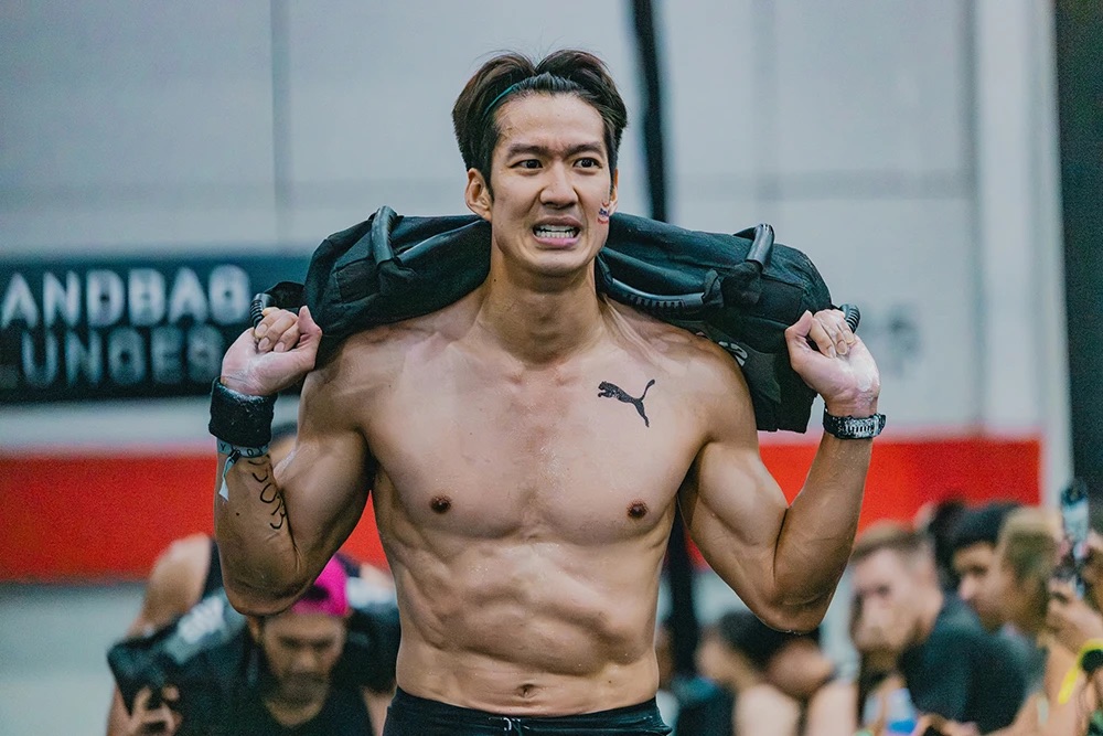 - Sandbag Lunges (แบกถุงทรายเดินย่อขา): 100 เมตร