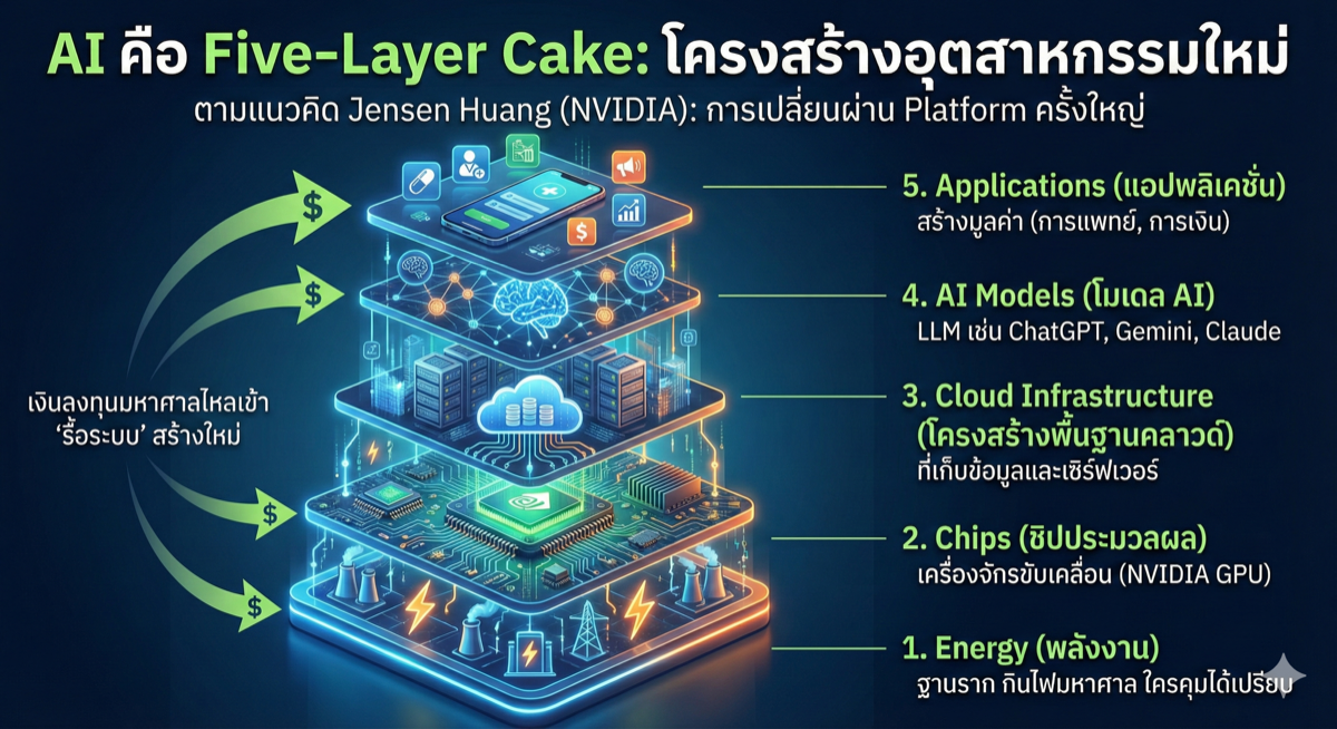 สิ่งที่ Jensen พยายามบอกคือ เงินลงทุนมหาศาลกำลังไหลเข้าสู่ทั้ง 5 ชั้นนี้ เป็นการ “รื้อระบบ” และสร้างโครงสร้างพื้นฐานใหม่ทั้งโลก