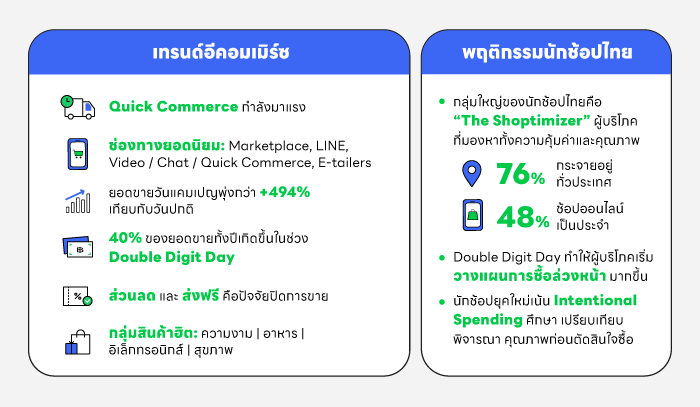 - ช่องทางอีคอมเมิร์ซที่ผู้บริโภคไทยนิยมซื้อ ได้แก่ Marketplace, Video Commerce, Chat Commerce, Quick Commerce, E-tailers