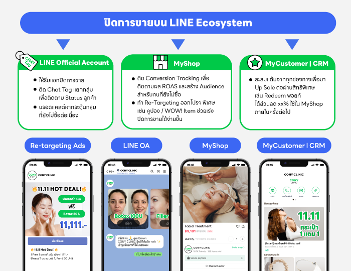 ไม่ว่าจะเป็น LINE Official Account (LINE OA), LINE Ads, MyShop และ MyCustomer l CRM ซึ่งแต่ละเครื่องมือมีจุดเด่นในการช่วยขับเคลื่อนแบรนด์ในแต่ละ funnel เพื่อนำพาแบรนด์ไปสู่การเติบโต ทั้งในช่วง Double Digit Day และในระยะยาว