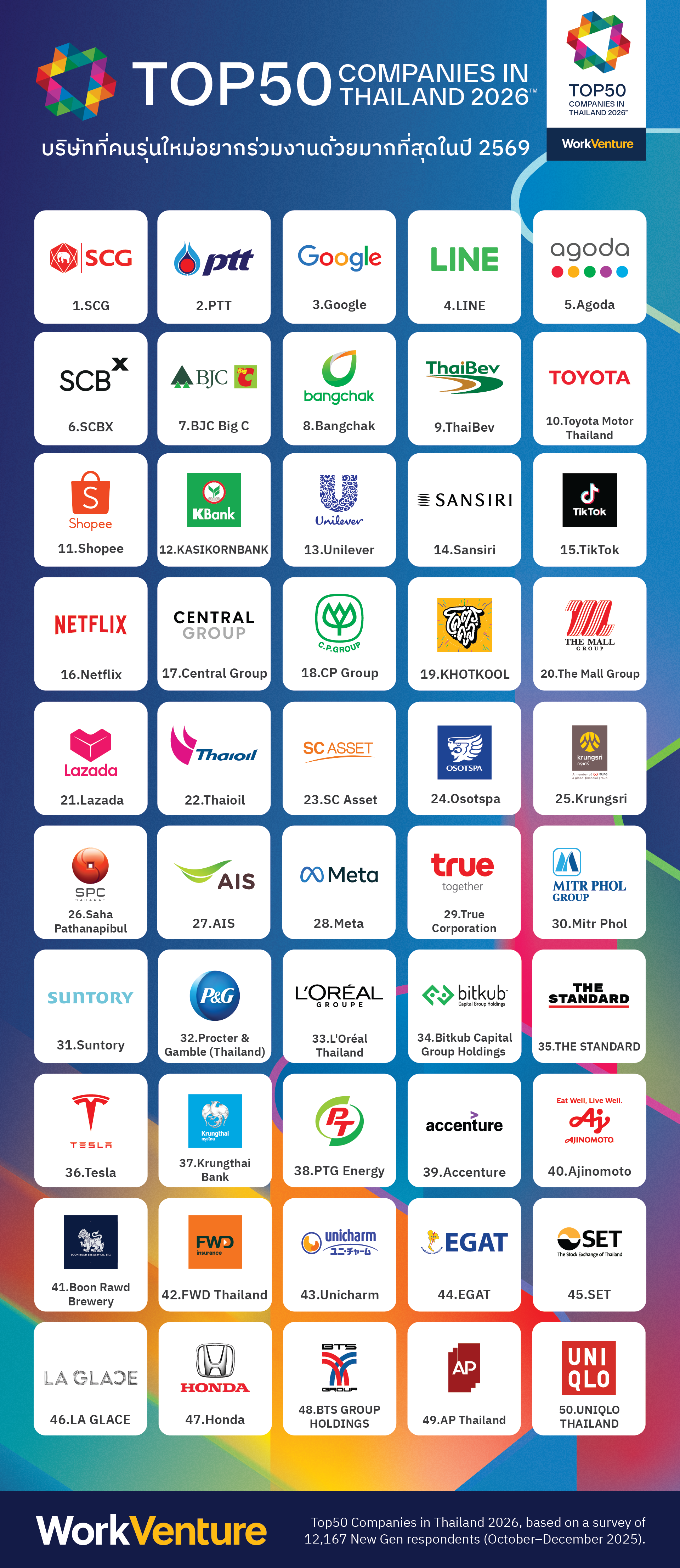 “WorkVenture” (เวิร์คเวนเจอร์) ที่ปรึกษาการสร้างแบรนด์นายจ้างแบบครบวงจร และผู้จัดทำผลสำรวจ 50 บริษัทที่คนรุ่นใหม่อยากร่วมงานด้วยมากที่สุด โดยจัดต่อเนื่องปีนี้เป็นปีที่ 8 ล่าสุดได้เปิดผลสำรวจ “TOP 50 Companies in Thailand 2026” หรือ 50 บริษัทที่คนรุ่นใหม่อยากร่วมงานด้วยมากที่สุด ปี 2569
